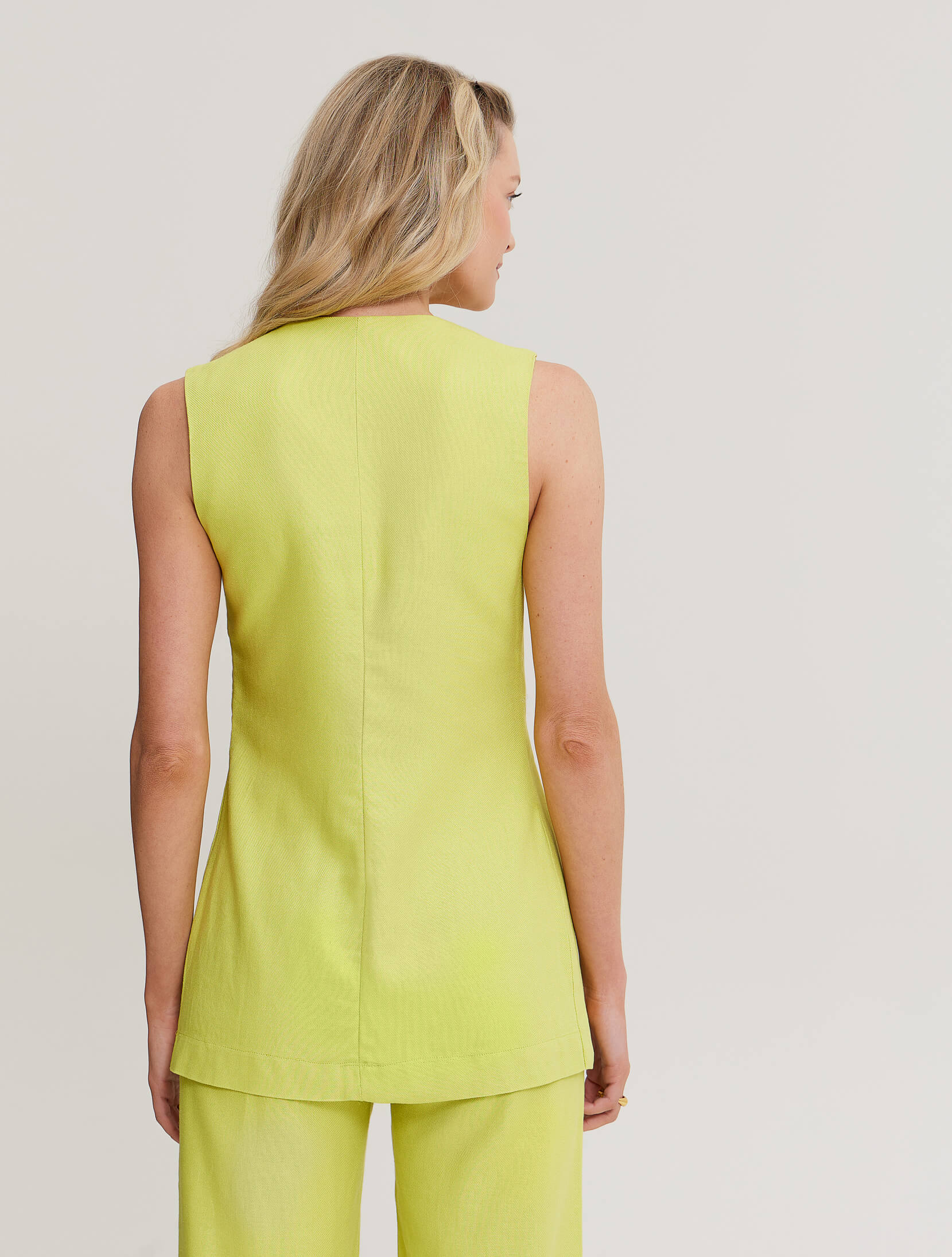 Blended linen vest-top. Front button closure with opening from the bust downwards.