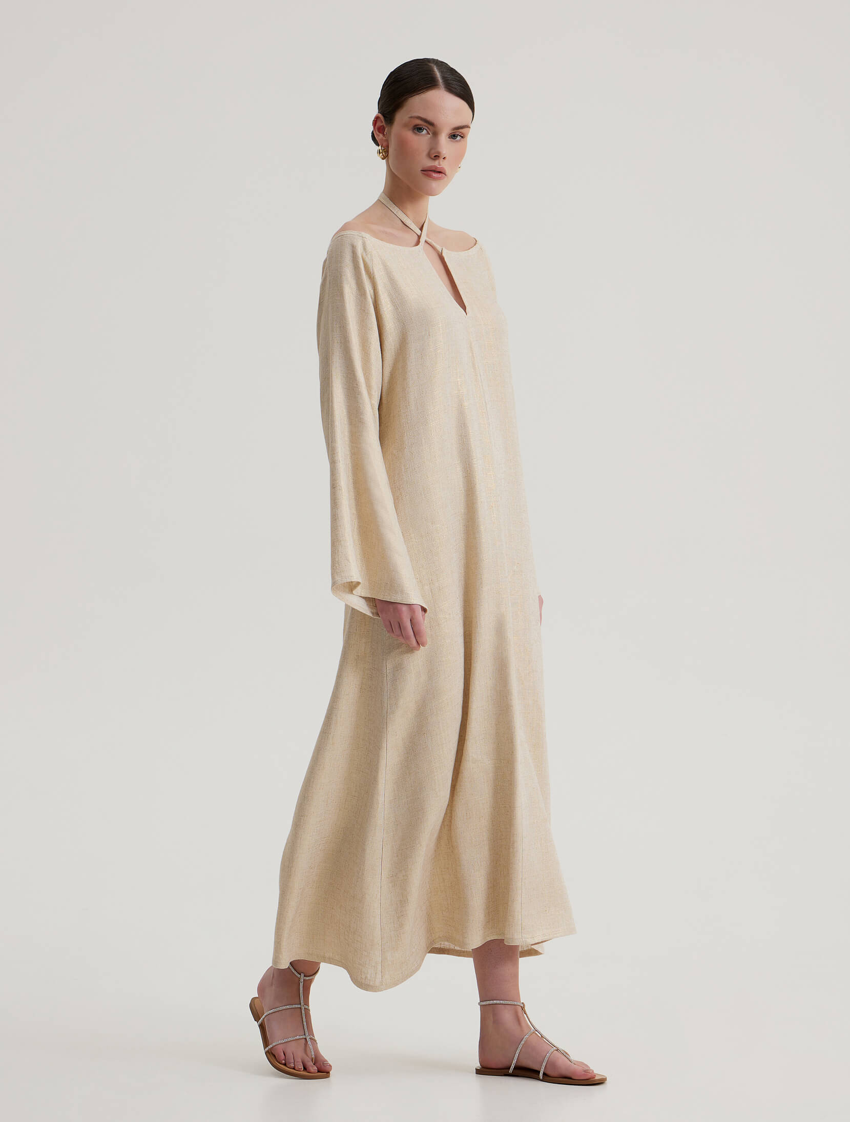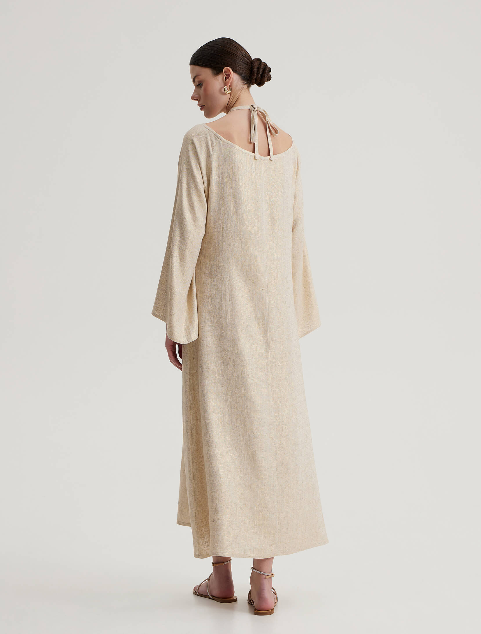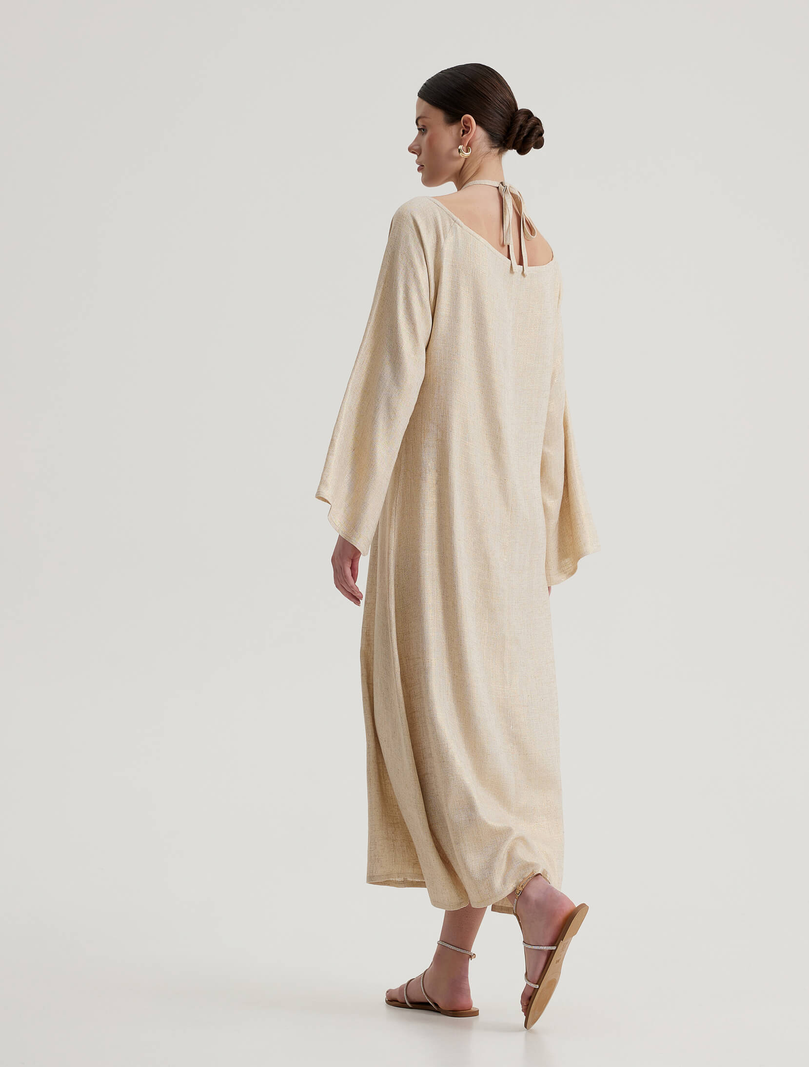 Ankle-length dress made from a linen blend with metallic thread, long bell sleeves, and a tie under the neck.
