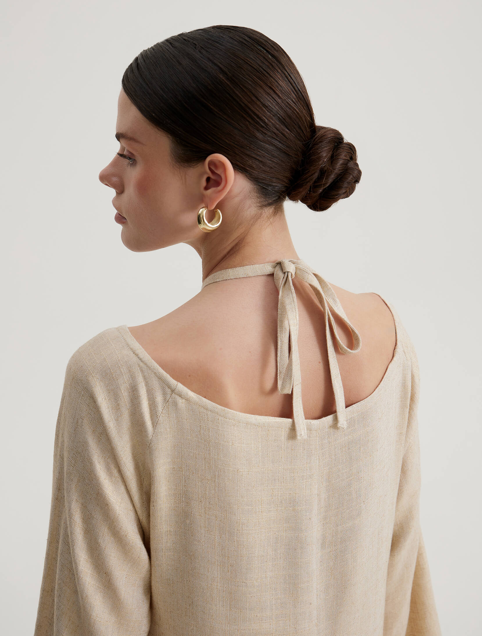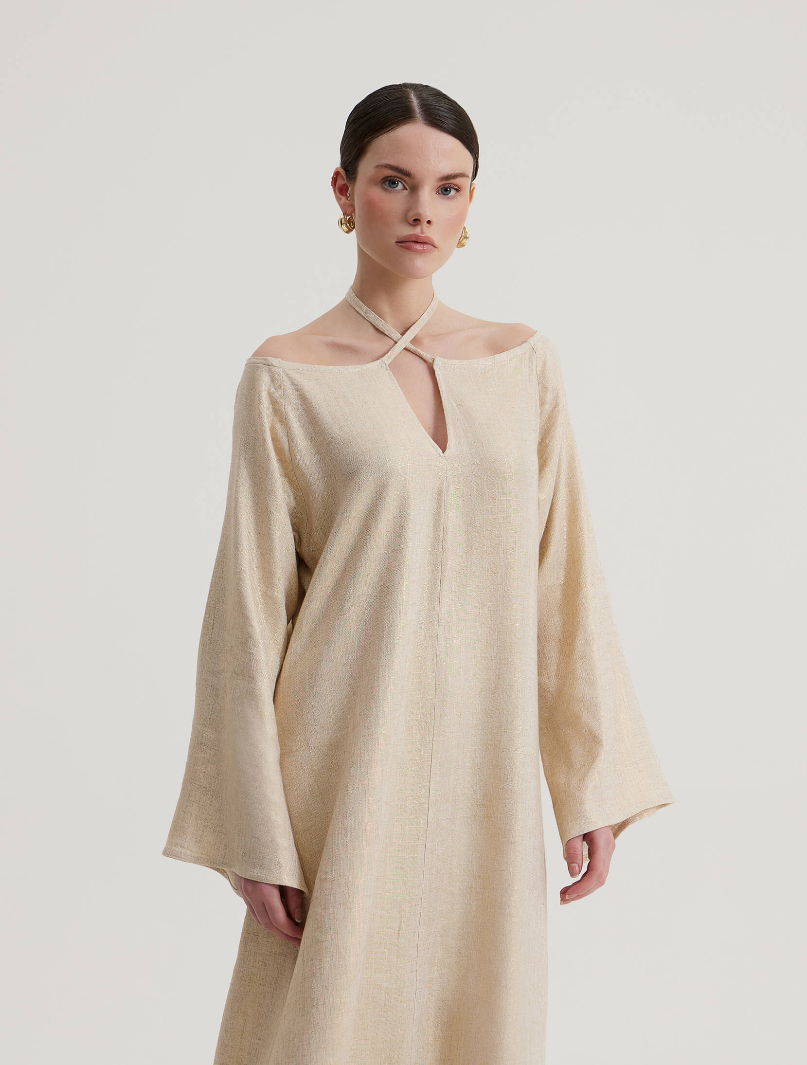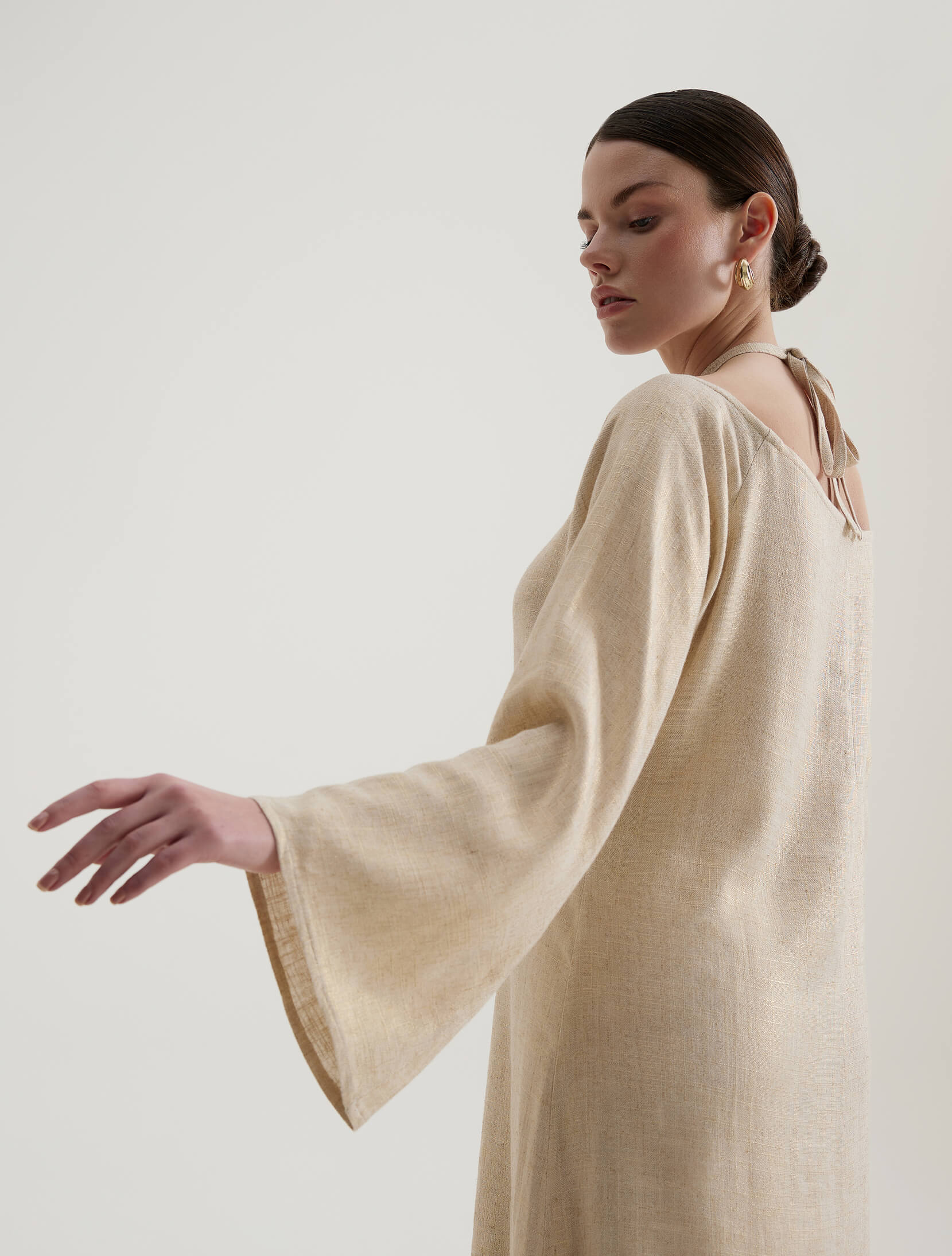 Ankle-length dress made from a linen blend with metallic thread, long bell sleeves, and a tie under the neck.