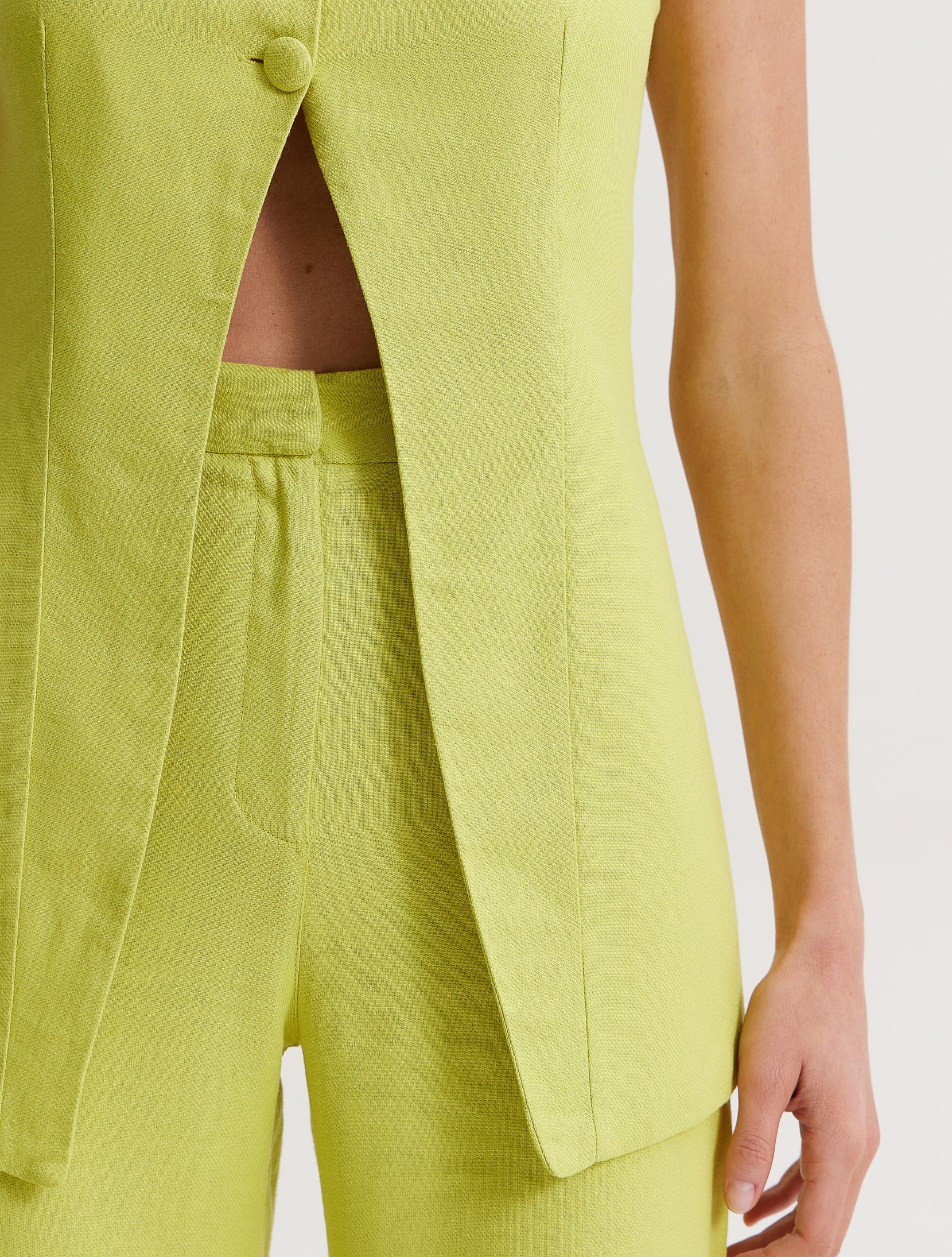 High-waisted cropped pants made of blended linen, straight cut, with front zipper closure.